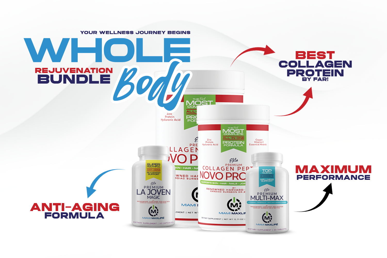 Featuring our powerful trio—Elite Premium Collagen for radiant skin and joint health, LA JOVEN Magic for anti-aging and longevity, and Multi-Max Multivitamin for all-day energy and wellness.